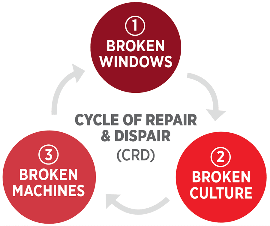This high level of human perceptiveness is applied to our work environment and maintenance culture. Let me give you an example. In criminology, there is a concept known as the broken windows theory. It states that “visible signs of crime, anti-social behavior and civil disorder, such as broken windows in abandoned buildings create an urban environment that fosters further crime and disorder, including serious crimes.” In other words, the perception of a neighborhood in decay bolsters criminal behavior.